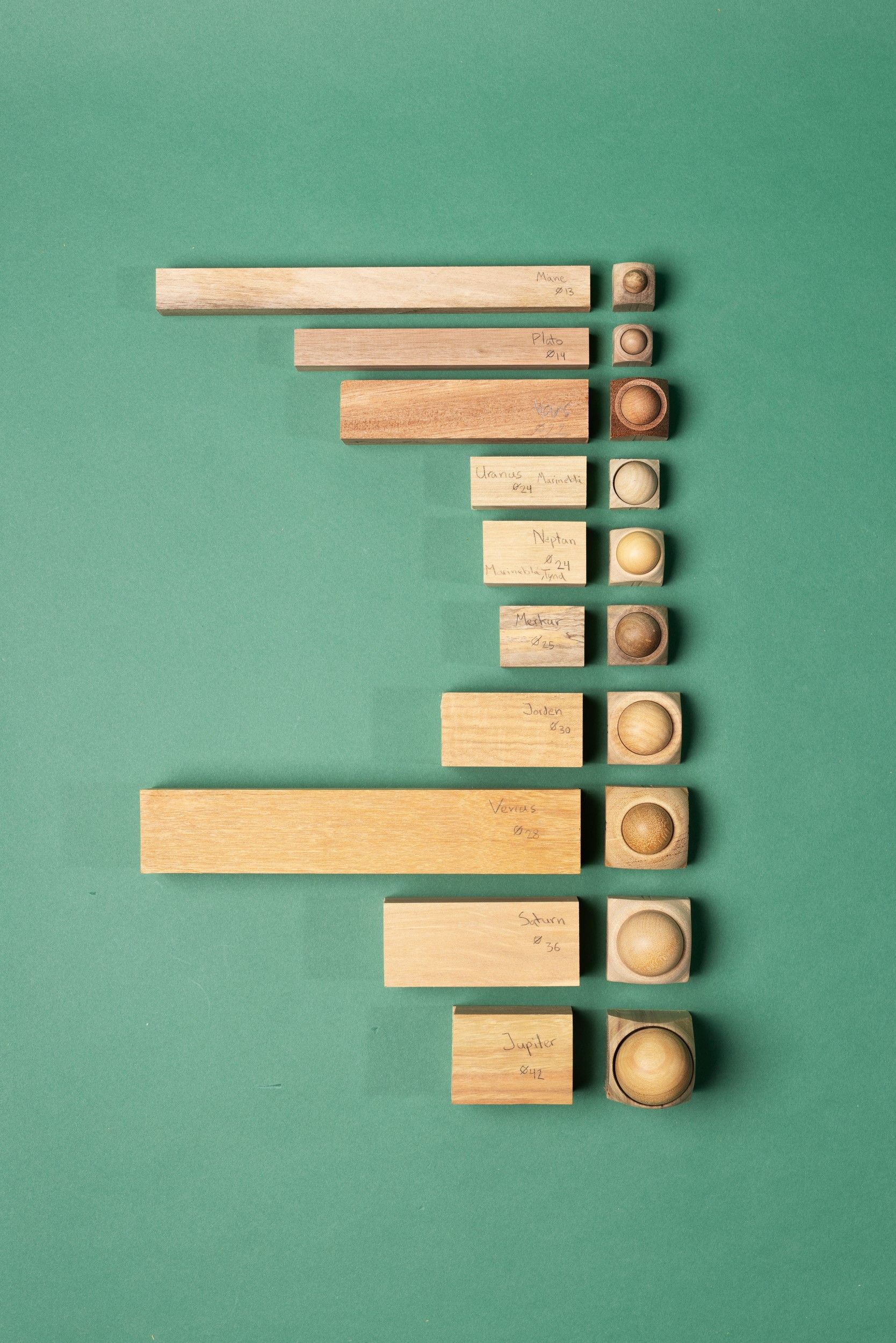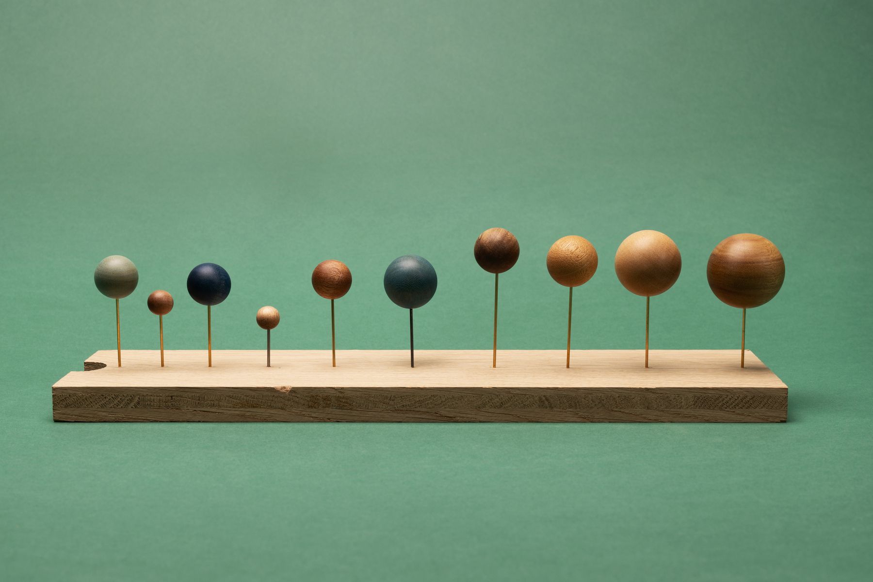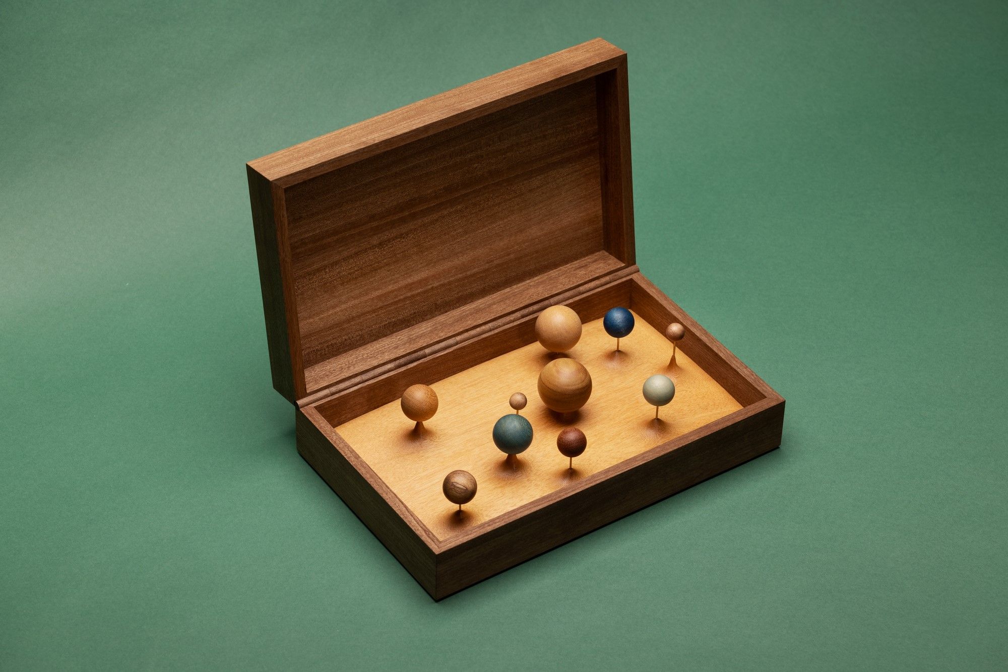 “Du milde Himmel” - The box contains an organically shaped interior, in which the planets of our solar system are depicted. Each planet is turned into a spherical shape, revealing the wood’s nuances, textures, and grain directions.