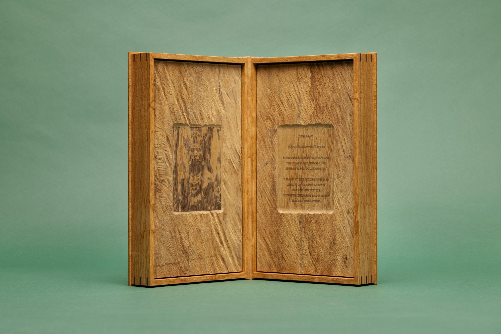 “Oplyst” - Stands upright and opens like a book - its contents reflect this. Inside, engravings in the wood describe the characteristics and origin of the wood species, as well as what the project aims to highlight and remind us of.